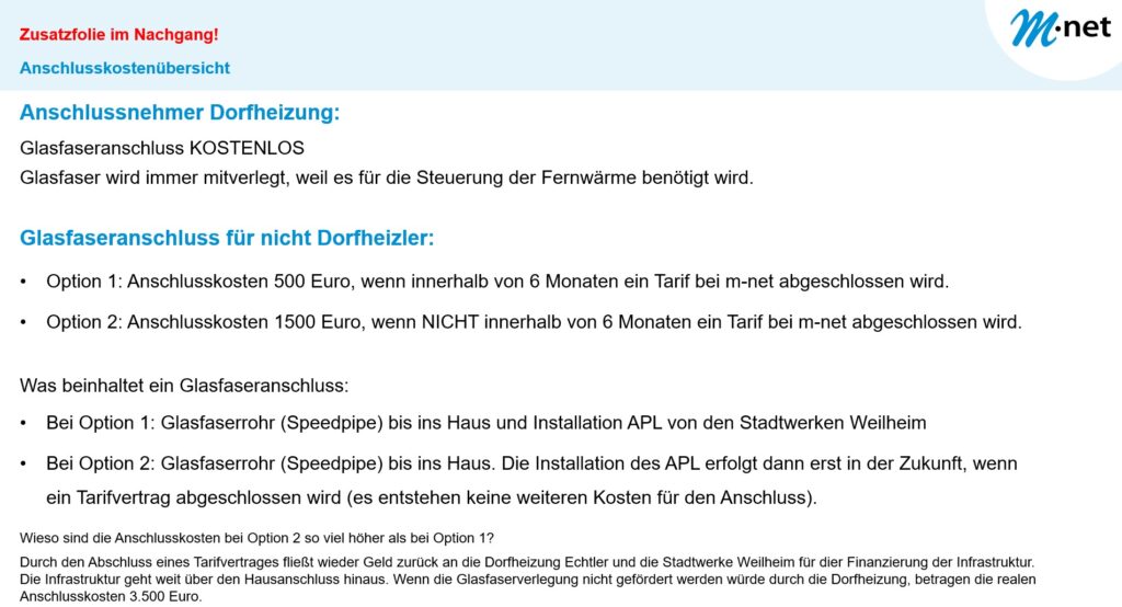 Bei der Infoveranstaltung gab es bei einigen Irritationen bzgl. der Anschlusskosten, wieso die Anschlusskosten dreimal so hoch sind wenn nicht innerhalb von 6 Monaten nach Anschluss ein Tarifvertrag abgeschlossen wird. Ein realer Anschluss ohne Fördergelder kostet ca. 3.500 Euro. Rein mit dem Anschluss ist es ja nicht getan sondern es muss auch eine Infrastruktur dahinter aufgebaut werden. Durch den Bau der Dorfheizung konnten die Tiefbaukosten auf ein Minimum reduziert werden. Auch die Stadtwerke Weilheim investieren erst einmal eine große Summe. Dadurch konnten wir den Anschlusspreis auf 1.500 Euro reduzieren. Bei einem Tarifabschluss fließt wieder ein kleiner Teil an die Dorfheizung Echtler und an die Stadtwerke Weilheim zurück, so dass wir die Anschlusskosten jetzt zunächst einmal auf 500 Euro reduzieren konnten. Wer jetzt einmal sich das im Kopf durchrechnet, wird schnell darauf kommen, dass das Glasfasernetz die nächsten 20 Jahre ein Nullsummenspiel ist.