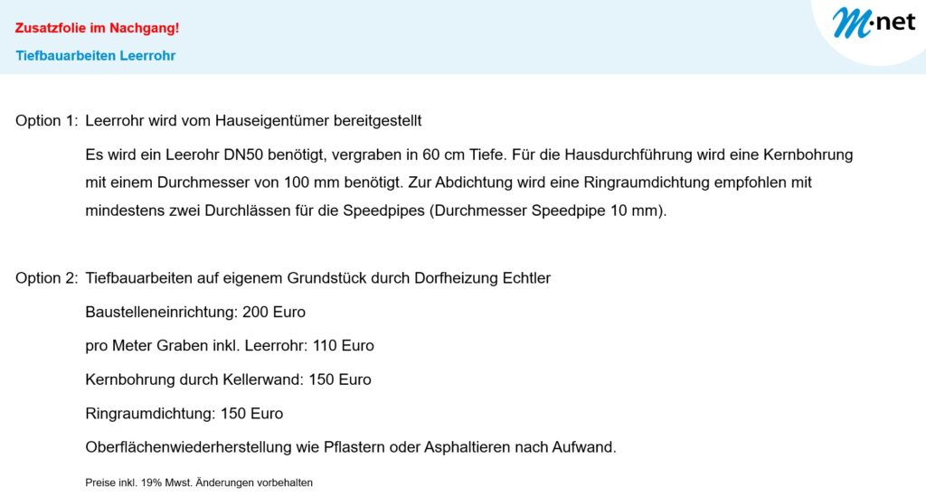 Wieso errichten die Dorfheizung Echtler und die Stadtwerke Weilheim trotzdem dieses Glasfasernetz? Weil unsere Meinung ist, dass es nicht akzeptabel ist die ganzen Straßen aufzureißen und dann eine wichtige zukunftsweisende Infrastrukturmaßnahme nicht mit umzusetzen.